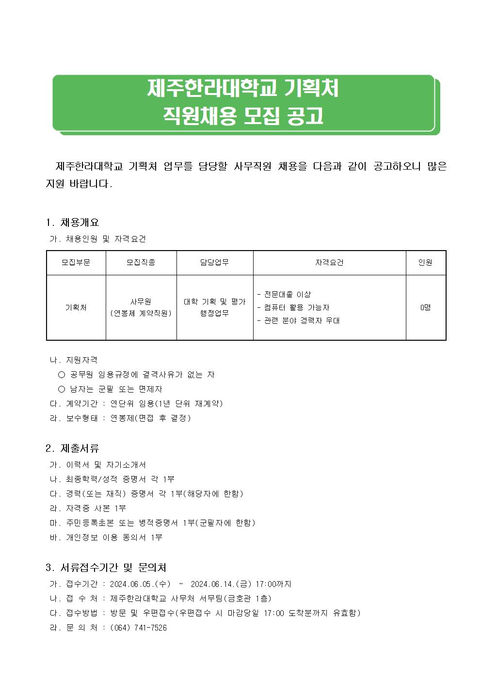 Á¦ÁÖÇѶó´ëÇб³ ±âȹó »ç¹«¿ø ä¿ë °ø°í