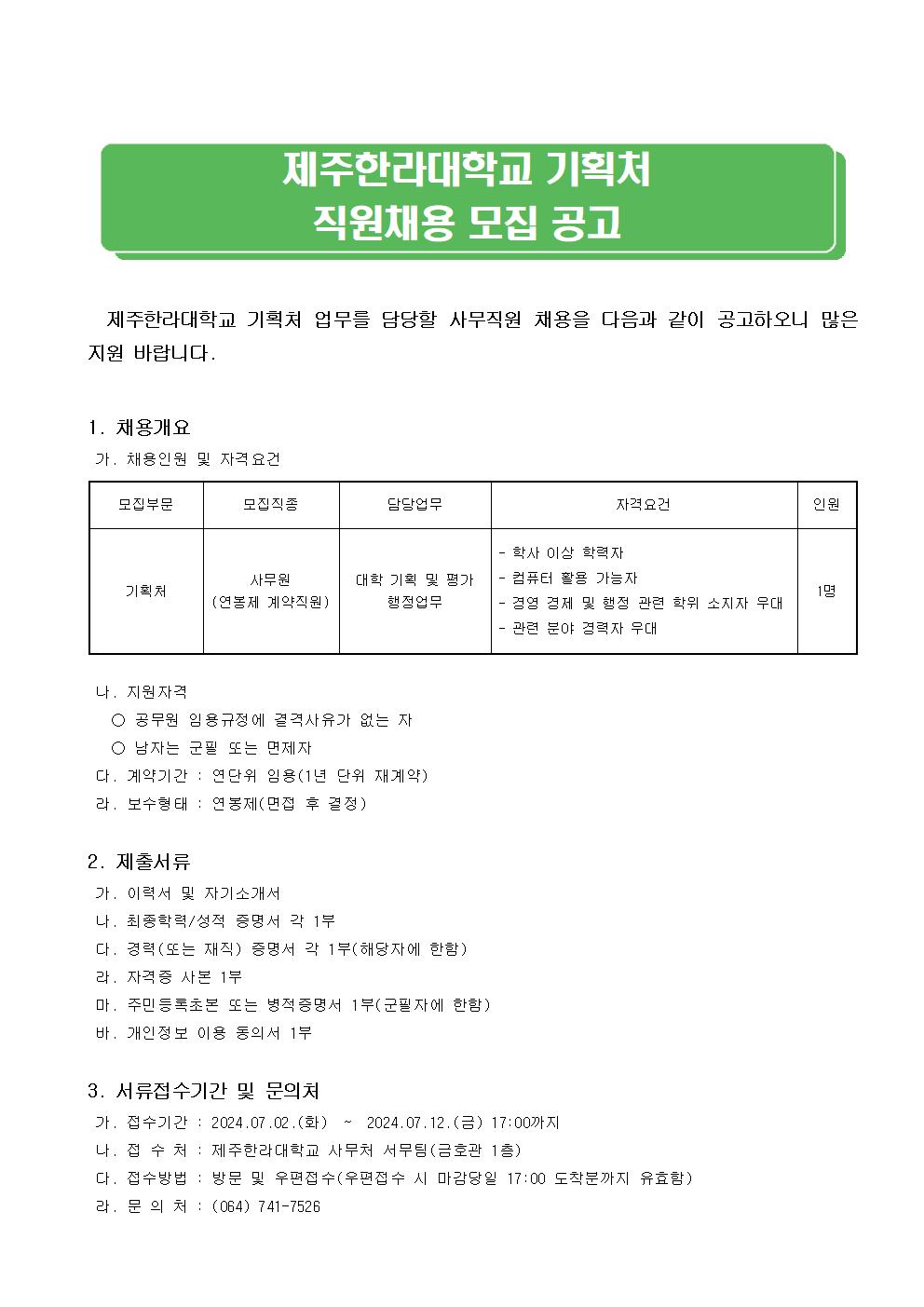 Á¦ÁÖÇѶó´ëÇб³ ±âȹó »ç¹«¿ø ä¿ë °ø°í