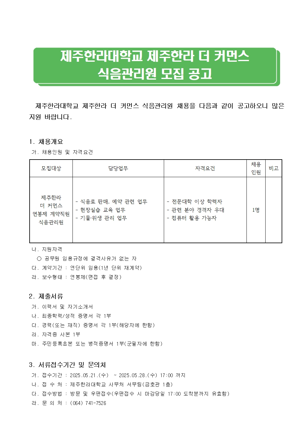 Á¦ÁÖÇѶó ´õ Ä¿¸Õ½º ½ÄÀ½°ü¸®¿ø ä¿ë °ø°í