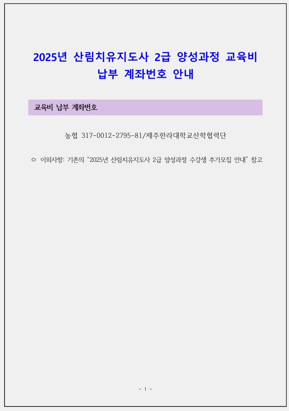 2025³â »ê¸²Ä¡À¯Áöµµ»ç 2±Þ ¾ç¼º°úÁ¤ ±³À°ºñ ³³ºÎ °èÁ¹øÈ£ ¾È³».hwp