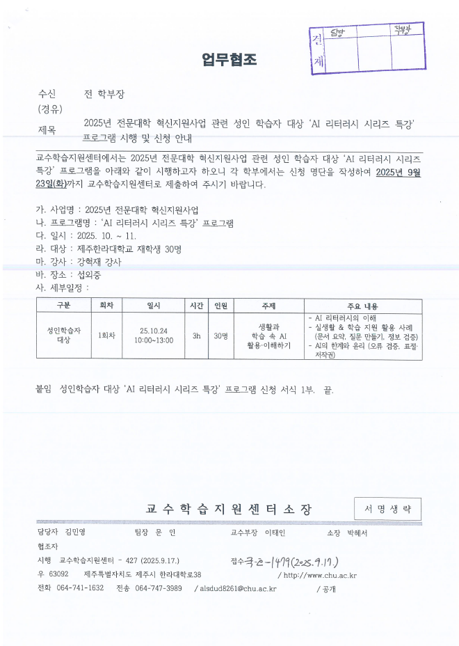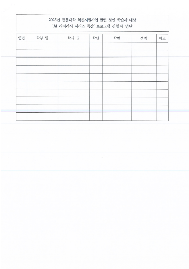 2025³â Àü¹®´ëÇÐ Çõ½ÅÁö¿ø»ç¾÷ °ü·Ã ¼ºÀÎ ÇнÀÀÚ ´ë»ó 'AI ¸®ÅÍ·¯½Ã ½Ã¸®Áî Æ¯°' ÇÁ·Î±×·¥ ½ÃÇà ¹× ½Åû ¾È³»