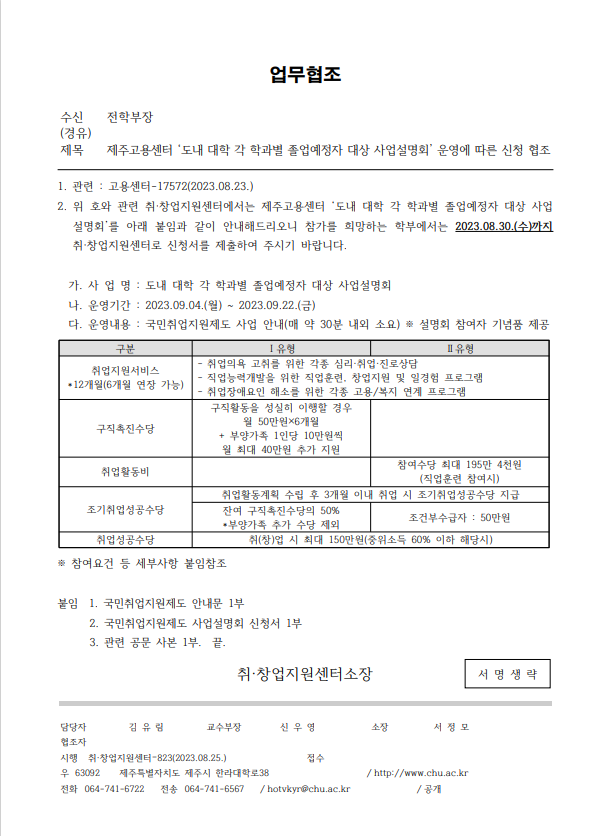 Á¦ÁÖ°í¿ë¼¾ÅÍ 'µµ³» ´ëÇÐ °¢ Çаúº° Á¹¾÷¿¹Á¤ÀÚ ´ë»ó »ç¾÷¼³¸íȸ' ¿î¿µ¿¡ µû¸¥ ½Åû