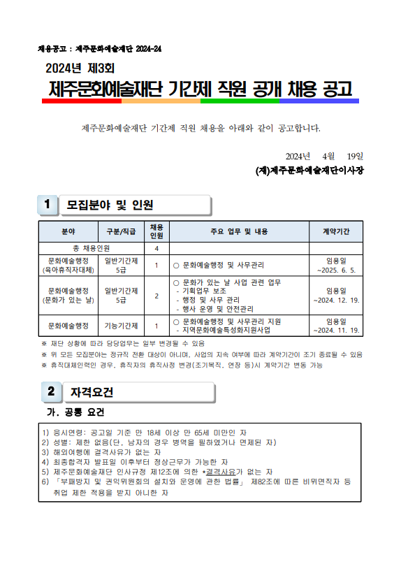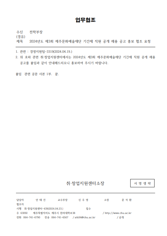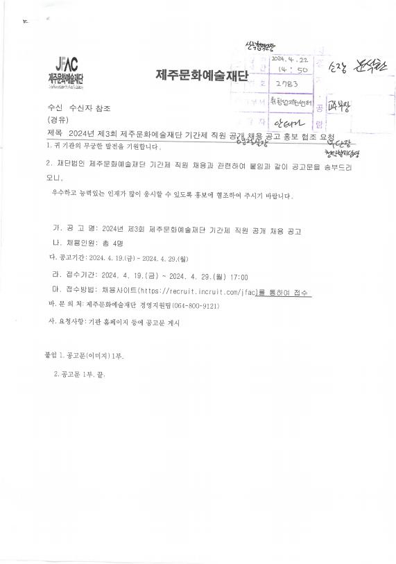 2024³âµµ Á¦3ȸ Á¦ÁÖ¹®È¿¹¼úÀç´Ü ±â°£Á¦ Á÷¿ø °ø°³ ä¿ë °ø°í È«º¸ ÇùÁ¶ ¿äû