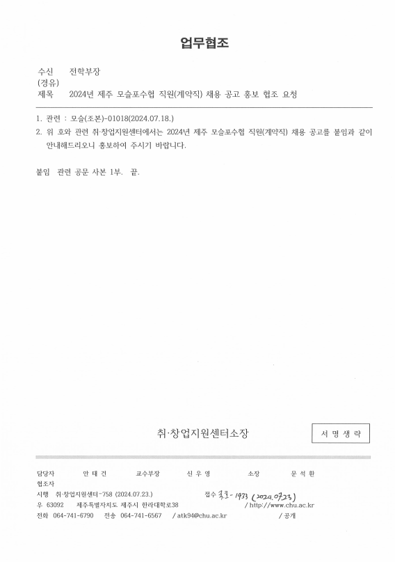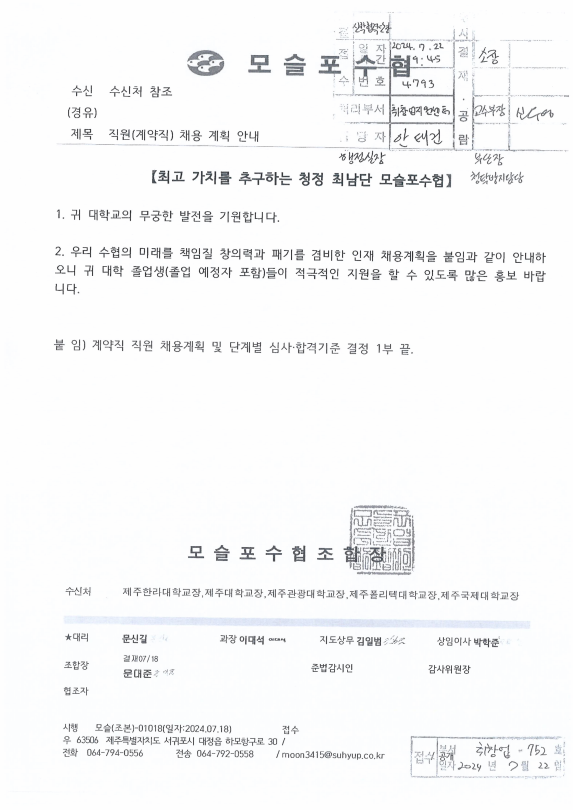 2024³â Á¦ÁÖ ¸ð½½Æ÷¼öÇù Á÷¿ø(°è¾àÁ÷) ä¿ë °ø°í È«º¸ ÇùÁ¶ ¿äû