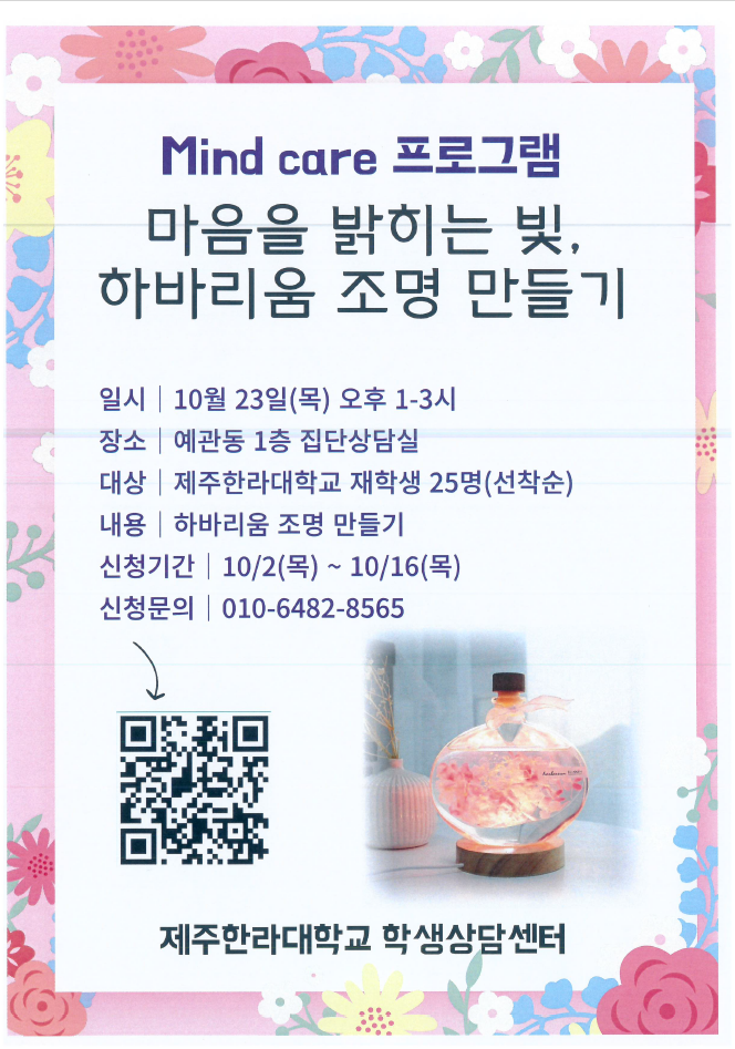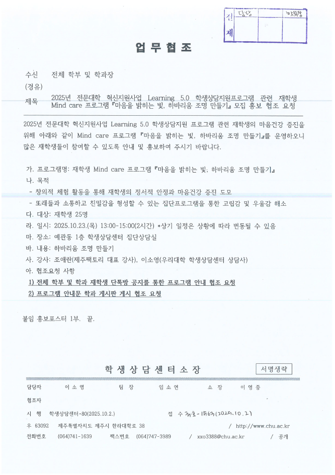 2025³â Àü¹®´ëÇÐ Çõ½ÅÁö¿ø»ç¾÷ Learning 5.0 Çлý»ó´ãÁö¿øÇÁ·Î±×·¥ °ü·Ã ÀçÇлý Mind care ÇÁ·Î±×·¥ ¸¶À½À» ¹àÈ÷´Â ºû, ÇϹٸ®¿ò Á¶¸í ¸¸µé±â ¸ðÁý È«º¸ ÇùÁ¶ ¿äû