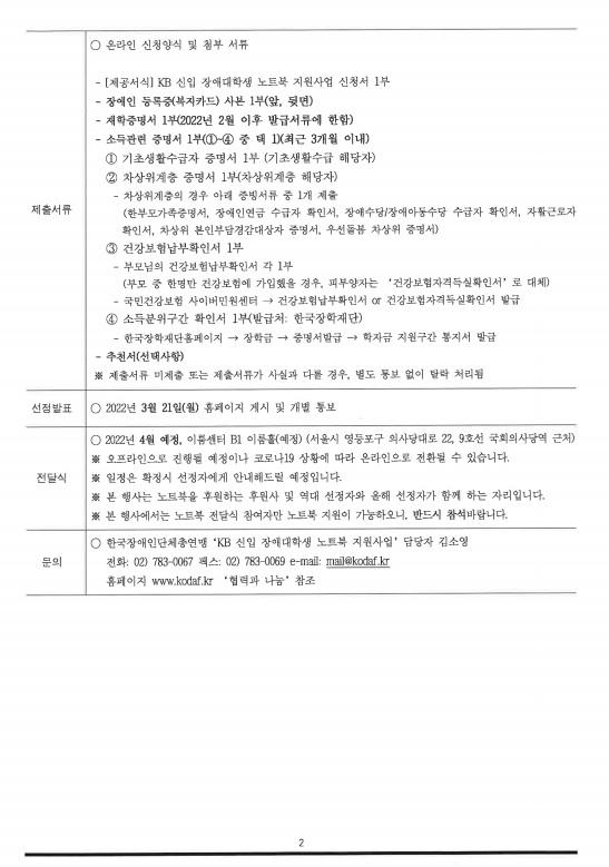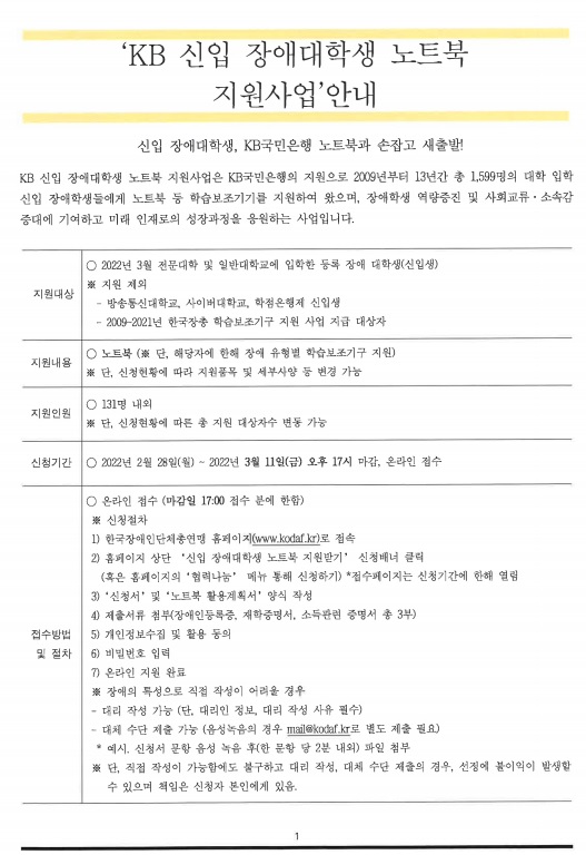 °¡. ³»¿ë : KB ½ÅÀÔ Àå¾Ö´ëÇлý ³ëÆ®ºÏ Áö¿ø»ç¾÷ ¾È³» ¹× È«º¸