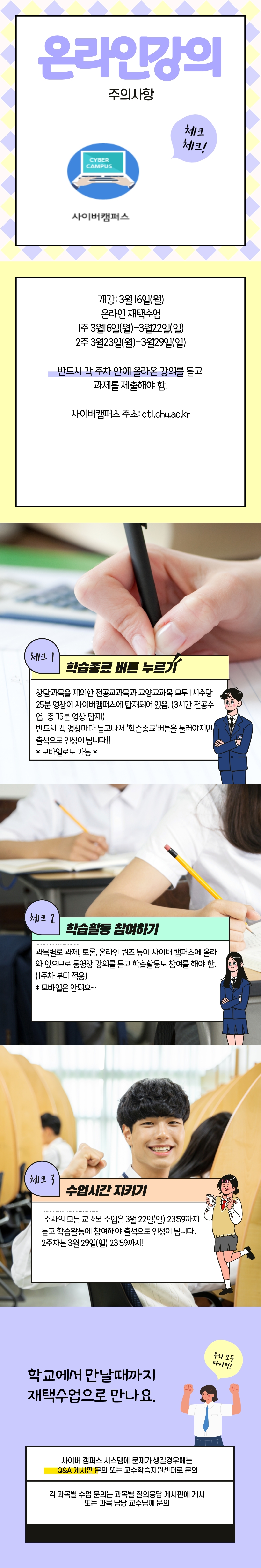 2020Çг⵵ 1Çб⠿ø°Ý ¿Â¶óÀÎ °ÀÇ °³°ÀÏÀº 3¿ù 16ÀÏ(¿ù) ÀÔ´Ï´Ù.1ÁÖ- 3/16(¿ù)~3/22(ÀÏ)2ÁÖ- 3/23(¿ù)~3/29(ÀÏ) °¢ ÁÖÂ÷¾È¿¡ ¿Ã¶ó¿Â °ÀǸ¦ ¼ö°ÇÏ¼Å¾ß Ãâ¼®,°úÁ¦Á¦Ãâ ÀÎÁ¤µÈ´Ù°í ÇÕ´Ï´Ù. »çÀ̹öÄ·ÆÛ½º ÁÖ¼Ò : ctl.chu.ac.kr